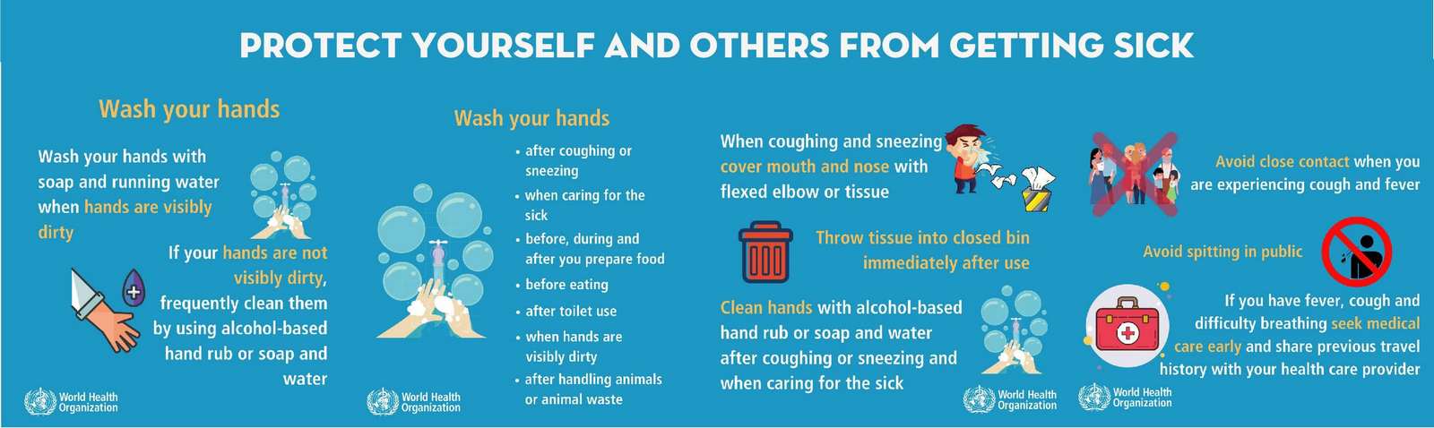 WHO’s standard recommendations for the general public to reduce exposure to and transmission of a range of illnesses are as follows, which include hand and respiratory hygiene, and safe food practices: